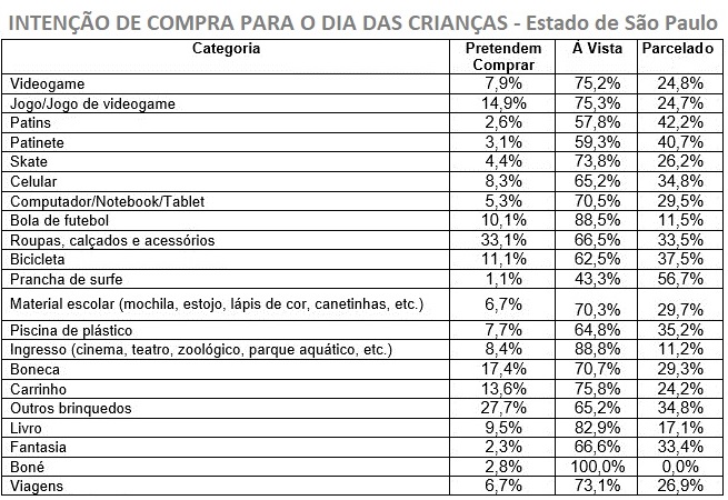 Pesquisa de intenção de compras para o Dia das Crianças realizada pela Associação Comercial de São Paulo (ACSP) com consumidores do Estado de São Paulo mostra que 49,7% dos entrevistados pretendem presentear na data, enquanto 38,2% responderam que não têm essa intenção e 12,1% ainda não sabem.