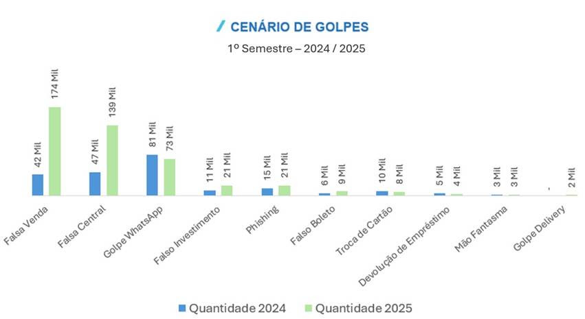 Completam o ranking de golpes do primeiro semestre de 2025 o golpe do falso investimento, phishing, falso boleto, troca de cartão, devolução de empréstimo, golpe da mão fantasma e golpe do delivery.