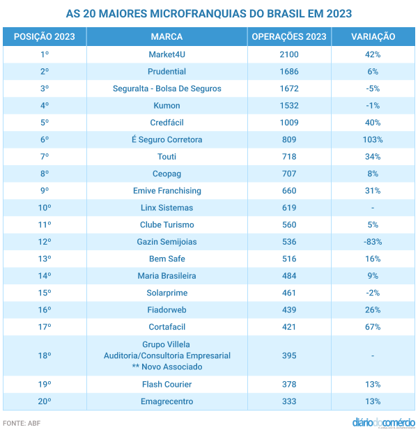 Com a market4u no topo, o ranking das 20 maiores microfranquias da ABF em 2023 contou com alguns destaques, com diversas empresas do segmento financeiro, como a Prudential (Seguros), que ficou em segundo, subindo de 1.594 para 1.686 unidades (6%), e a Seguralta, em terceiro, com 1.672 (-5%).
