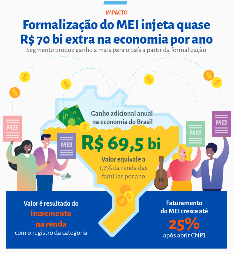 A atuação dos microempreendedores individuais (MEI) é responsável pela movimentação de bilhões de reais por ano no país. Em avaliação de impacto inédita, realizada pelo Sebrae em parceria com a Fundação Getulio Vargas (FGV), foi revelado que o efeito da formalização do MEI gira entre R$ 19,81 bilhões e R$ 69,56 bilhões. Esse incremento é estimulado pelo aumento de renda que os pequenos negócios obtêm ao se formalizarem. Ao conquistarem um CNPJ, aumentam a renda entre 7% e 25%.