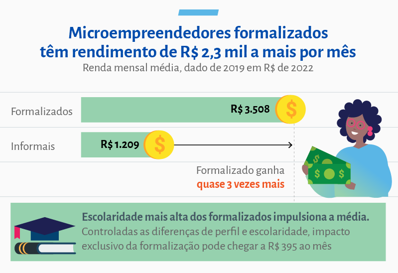 Parte dessa diferença se explica pela escolaridade maior do primeiro grupo. Porém, quando controlado para as diferenças de perfil e escolaridade dos dois grupos de empreendedores, a formalização por si só é responsável por um ganho de até R$ 395 por mês.