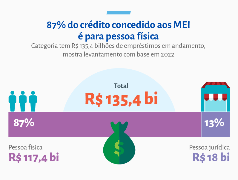 No fim de 2022, os microempreendedores individuais (MEI) possuíam um estoque de crédito de R$ 135,4 bilhões, sendo que, desse montante R$ 117,4 bilhões, o que equivale a 87% do valor total, foram solicitados como pessoa física e apenas R$ 18 bilhões por meio de pessoas jurídicas. O universo de tomadores é de 844,2 mil como pessoas jurídicas, e outros 5,3 milhões como pessoas físicas.
