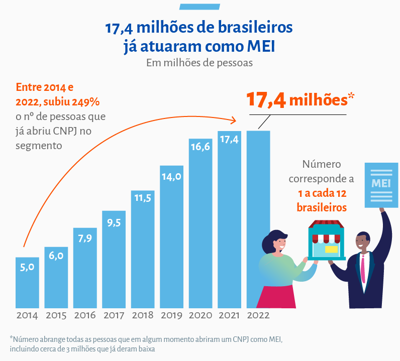 Desde o início da figura jurídica do MEI, cerca de 17,4 milhões de brasileiros tiveram em algum momento um CNPJ de Microempreendedor Individual, o que corresponde a 1 a cada 12 brasileiros.