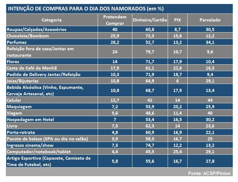 Pesquisa da Associação Comercial de São Paulo (ACSP), encomendada à Pinion, aponta que as roupas, calçados e acessórios lideram a intenção de presentes no Dia dos Namorados 2022. Pouco mais de 35% dos entrevistados vão presentear na data, enquanto 49,3% disseram que não pretendem comprar. Outros 15% não souberam informar. Foram entrevistadas 1.712 pessoas em todas as regiões do país.