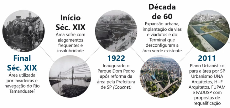 Até a inauguração do Parque Ibirapuera, em 1954, o Parque Dom Pedro sustentava o título de maior da capital. Sua região era conhecida como a Várzea do Carmo e por estar periodicamente alagada pelas águas do tortuoso Rio Piratininga, que depois teve seu nome mudado para Rio Tamanduateí, era considerada como uma limitação para o crescimento da cidade para o Leste. Até que, no início do século XIX, o engenheiro Florêncio Moreira elaborou um projeto para sua retificação.