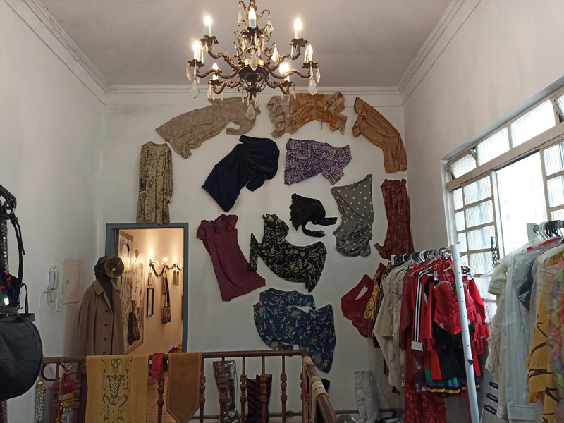 Vestidos de festas, um armário com acessórios e bonecas antigas, chapéus dos anos 60 com as caixas usadas para transportá-los, máscaras de lutadores dos anos 90, como as usadas na luta livre mexicana, sapatos, casacos de pele para o inverno europeu, malas e joias de diferentes lugares e épocas completam o ambiente, distribuído em dois andares.