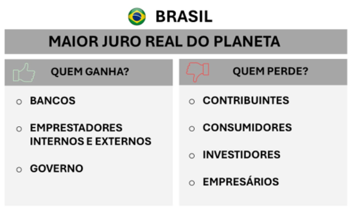 Com a recente decisão, a taxa básica de juros - a Selic – foi a 13,25%. O Brasil é agora a nação com a maior taxa de juros real do planeta, lembrando que a comparação é feita sempre descontando a taxa de inflação de cada país, embutida nos juros correntes. Calculando: se a Selic agora vale 13,25% e a inflação de 2024 foi de 4,8%, a taxa real de juros resulta da divisão entre 1,1325 e 1,048, que dá 1,08 ou 8% ao ano. Olhando para frente, a pesquisa Focus nos indica que, no final de 2025, o mercado já projeta a Selic em 15,1% e a inflação em 5,6%. Calculando de novo, o juro real campeão do mundo, no fim de 2025, irá a 9%. Mas no mercado bancário já se trabalha com taxas reais de 10% ou mais.