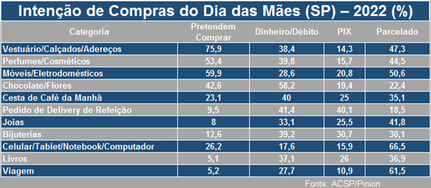 Pesquisa nacional de intenção de compras da Associação Comercial de São Paulo (ACSP), elaborada pela Pinion, aponta que 50% dos brasileiros pretendem dar presentes no Dia das Mães.