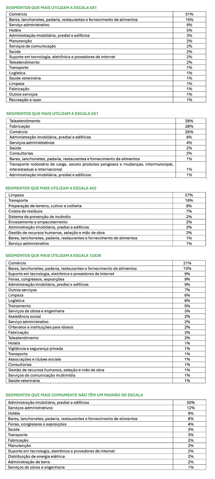 Já a escala 5x1 é predominantemente usada pelos segmentos de teleatendimento (28%), fabricação (28%) e comércio (25%).