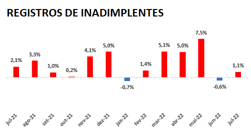 Os registros de inadimplentes no banco de dados da Boa Vista aumentaram 1,1% entre os meses de junho e julho, já com os números dessazonalizados. O resultado ocorre após o indicador apontar queda de 0,6% em junho.