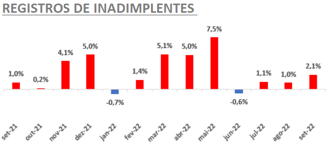O volume de inadimplentes registrado no banco de dados da Boa Vista cresceu 2,1% em setembro, na comparação com o resultado de agosto. Essa foi a terceira alta mensal seguida do indicador, que no ano já acumula elevação de 16,3%.