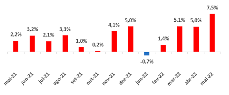 Na comparação com maio do ano passado, o indicador subiu 12,7% e acumula alta de 12,4% no ano. Na análise de longo prazo, medida pela variação acumulada em 12 meses, a curva se manteve numa trajetória de crescimento acelerado, passando de 6,2% em abril para 7,3% em maio.