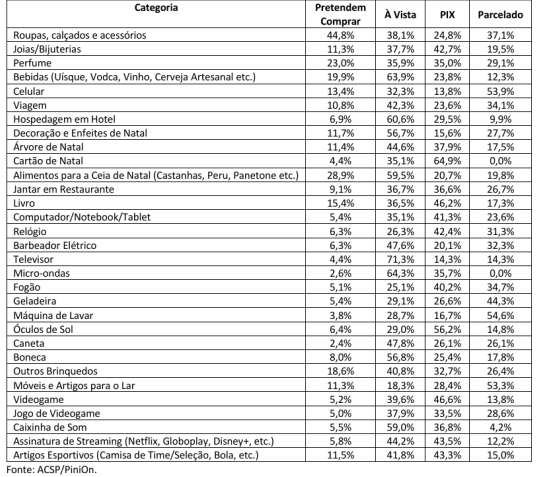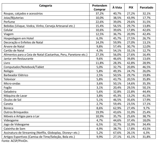 Produtos - Como é habitual no Natal, roupas, calçados e acessórios (37,2%) são os principais itens da lista. Somados a outros itens de uso pessoal, tais como joias, bijuterias e perfumes, perfazem 69,8% das intenções de compra.