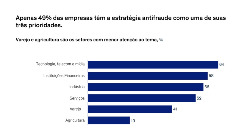 Em termos de preocupação contra fraudes por parte de suas lideranças, o setor varejista (ver gráfico) fica à frente apenas do Agro, em que a questão é estratégica para apenas 19% dos CEOs. Mas está atrás de todos os demais: Serviços (52%), Indústria (56%), Instituições Financeiras (58%) e Tecnologia-Telecom-Mídia (64%). O reflexo disso é uma estimativa de perdas de até US$ 130 bilhões ao ano por causa das fraudes na América Latina. Nos últimos dois anos, 54% das corporações registraram aumento nas perdas. No Brasil foi pior: 60%.
