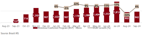 De acordo com os dados obtidos pelo Santander, desde que o Remessa Conforme foi lançado, em 2023, ainda sem a taxação, a movimentação saiu de R$ 137 milhões (setembro de 2023) para R$ 1,8 bilhão (julho de 2024, último mês sem a cobrança das alíquotas). Um crescimento vertiginoso superior a 1.200%. O freio provocado pelo aumento dos preços via taxação derrubou o avanço dessas compras para a metade. Mesmo assim, os R$ 942 milhões movimentados em setembro deste ano já representam alta de 587% em relação aos dados iniciais do Remessa Conforme (ver gráfico 2, abaixo).