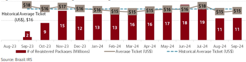 Outras duas variações notáveis (ver gráfico 3, acima) foram a queda no tíquete médio e no volume de pacotes enviados. No primeiro indicador, ele cai 17%, de US$ 18 (julho, pré-taxação) para US$ 15 (pós-taxação), mesmo com o dólar mais caro nesse período.