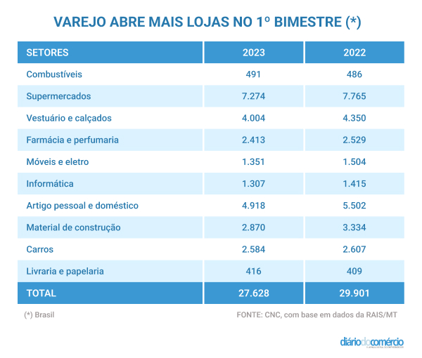 Veja abaixo, por setor, as aberturas de lojas nos dois primeiros meses de 2022 e 2023, números que incluem lojas físicas e virtuais.