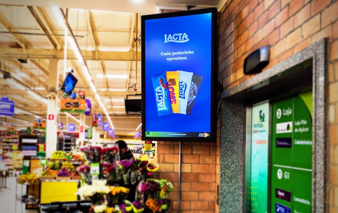 Nas lojas físicas, geralmente, os anúncios são veiculados em telas, localizadas na entrada dos estabelecimentos, para chamar a atenção do consumidor antes de efetuar as compras.
