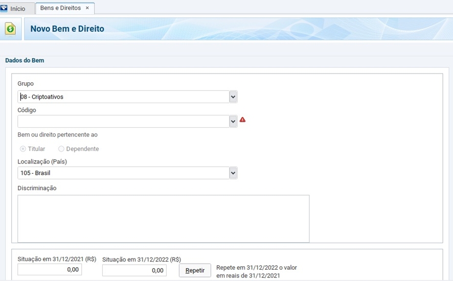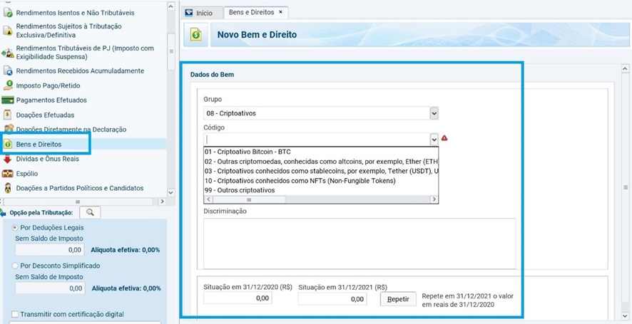 Acesse a ficha “Bens e Direitos”, selecione o grupo “08 – Criptoativos” e escolha um dos códigos disponíveis.