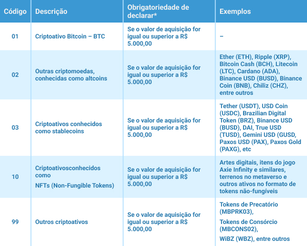 O código 01, por exemplo, é exclusivo do criptoativo Bitcoin (BTC) e é o mais comum adquirido pelas pessoas, mas há outros, conforme tabela abaixo. As Altcoins receberam o código 02; as Stablecoins o código 03; as NFTs o 10; e, por fim, Outros Criptos, o código 99. Neste ano, o código dedicado aos NFTs é novidade no programa da Receita Federal.
