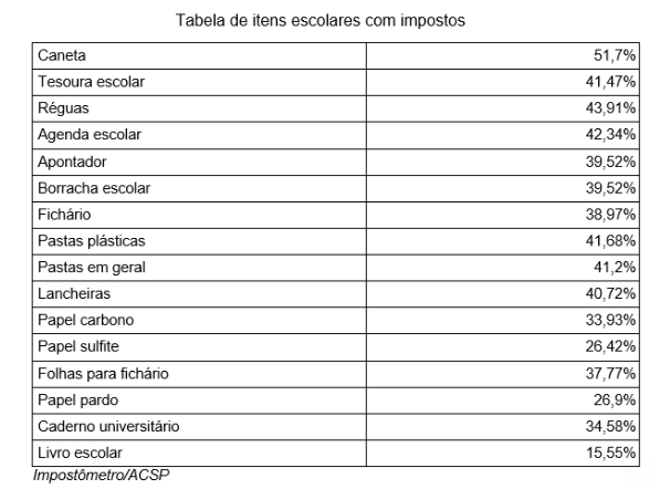 Levantamento realizado pela Associação Comercial de São Paulo (ACSP), com base nos dados do Impostômetro, revela a alta carga tributária em itens da lista de material escolar. No caso da caneta, por exemplo, os impostos equivalem a 51,7% do preço final do produto.