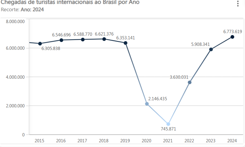 De janeiro a agosto, a receita com turismo estrangeiro no Brasil somou US$ 5,4 bilhões, crescimento de 11,7% em relação a igual período de 2024. Os dados, do Banco Central, foram divulgados pela Embratur. No mesmo período, o país recebeu 6,5 milhões de visitantes internacionais, com alta de 46,6%. Isso indica que 2025 irá representar recorde, porque o número parcial já se aproxima do total do ano passado – 6,8 milhões. Segundo a Embratur, o resultado de agosto (576 mil, +37,8%) foi o melhor da história. O recorde era de 2016 (537 mil), durante a disputa dos Jogos Olímpicos no Rio de Janeiro.