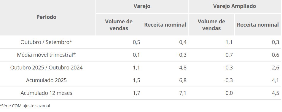 “O panorama é de desaceleração do consumo, principalmente aquele mais dependente de crédito”, disse Ruiz de Gamboa. Ele cita o segmento de veículos, motos e peças, que cai 4,3% em relação a outubro de 2024, 3% no ano e 1,7% em 12 meses. Segundo o economista, a projeção do instituto para este ano pode ser revista. Por enquanto, se situa em torno de 2%. Esse número já representaria menos da metade do resultado da PMC em 2024, quando o volume de vendas do comércio varejista cresceu 4,7%, o melhor resultado desde 2012. As vendas crescem menos ou caem em volume, mas registram alta em receita: +6,8% no ano e +7,1% em 12 meses no varejo restrito e +4,1% e +4,5%, respectivamente, no varejo ampliado.